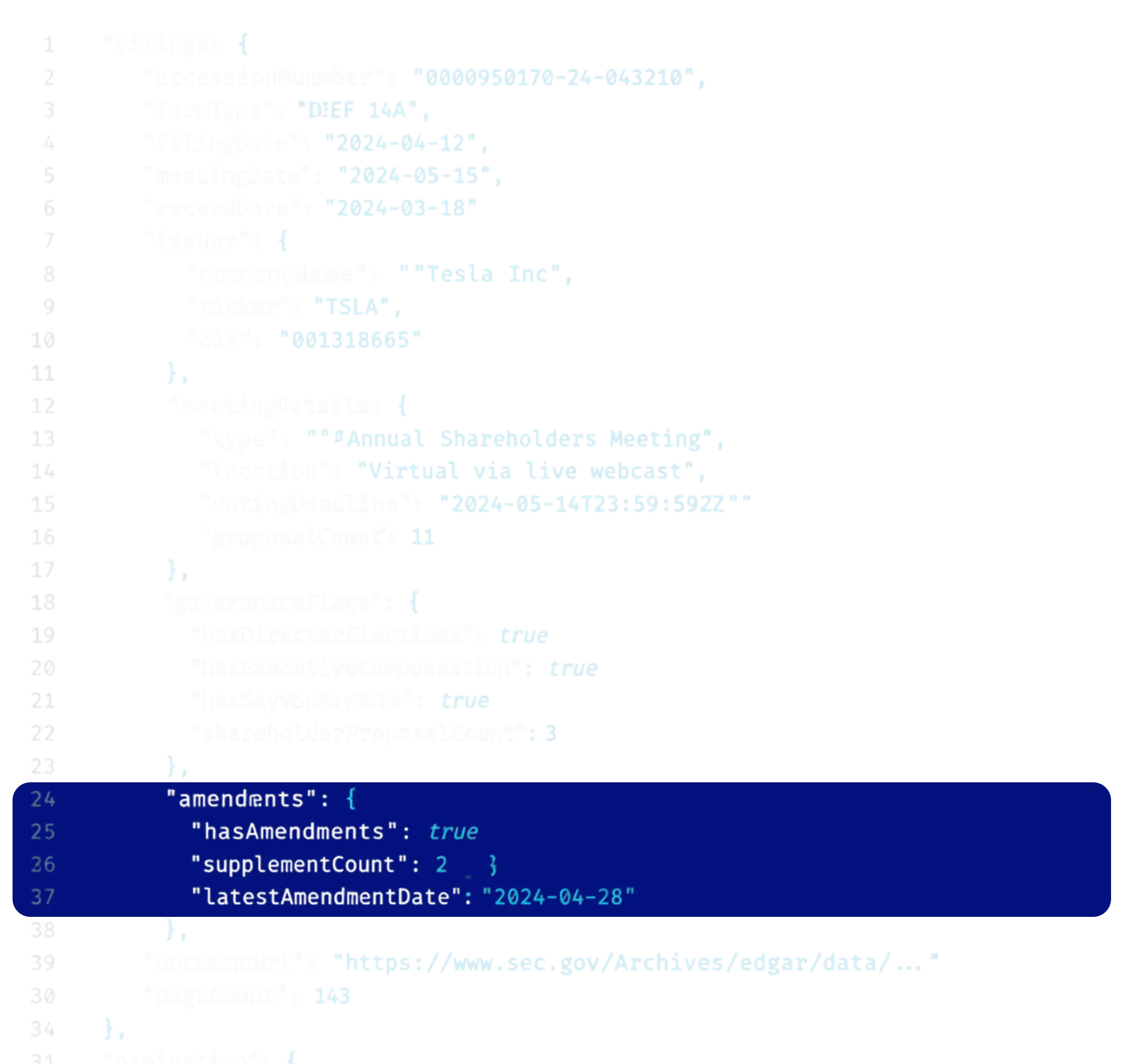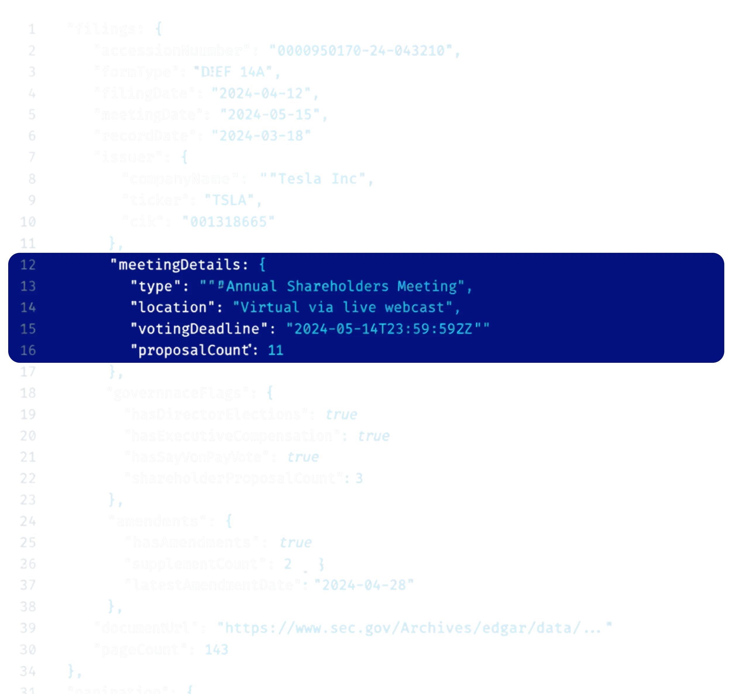 Proxy metadata arrives with meeting details, topic flags, and amendment relationships. JSON serves real-time applications while CSV export supports spreadsheet analysis and governance research databases.