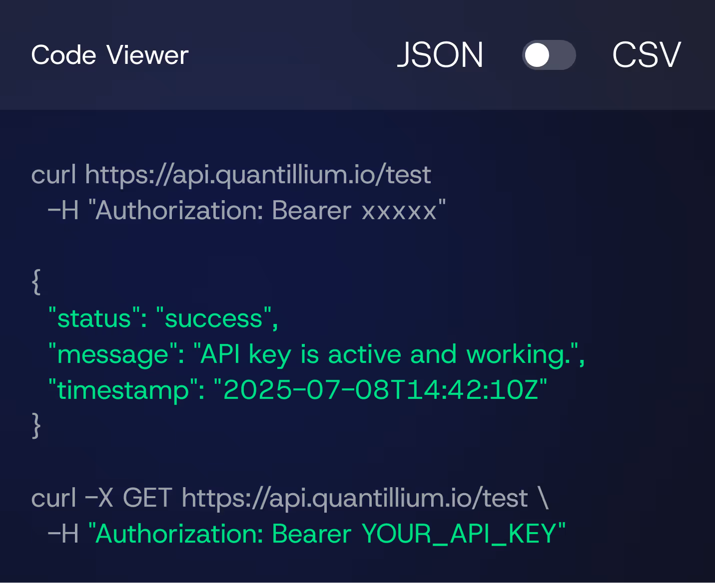 Quantillium returns filings in a clean, consistent structure. You receive metadata and documents in formats that support fast analysis and direct integration into your systems. The API delivers all data in JSON by default, and you can export results in CSV when you need tabular outputs for research, spreadsheets, or batch processes.